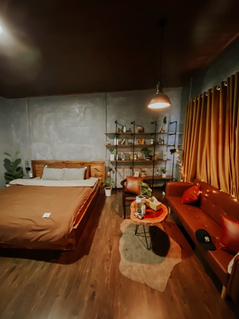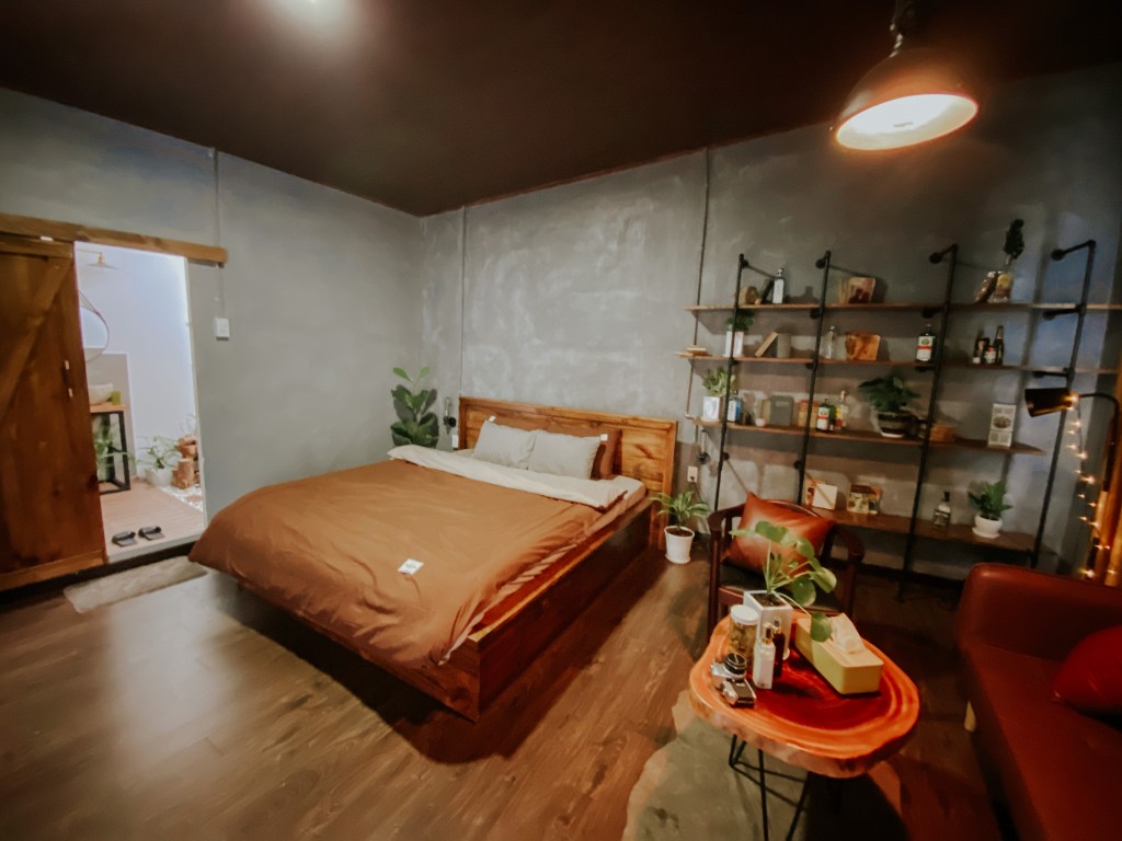 Ngày hôm sau, mình dời từ căn phòng “Trắng” để dọn vào phòng “Xám”. Đúng với tên gọi, phòng được sơn màu xám đậm cùng nội thất trái ngược hẳn với phòng “Trắng” với gỗ đậm màu hơn, nhiều cây xanh đặt trong phòng và một căn phòng tắm rộng, thoáng đãng.