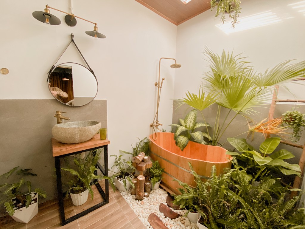 Mình thích chiếc bồn tắm nhất, với một cổng trời ở trên lấy ánh sáng tự nhiên vào bồn, có thể dùng để vừa tắm vừa phơi nắng. Xung quanh bồn là nhiều cây xanh, ngồi vào bồn tắm như được đưa đến cánh rừng hoang dã nào đó và vị khách đến nghỉ là người thám hiểm tắm trong ngọn suối hiền.