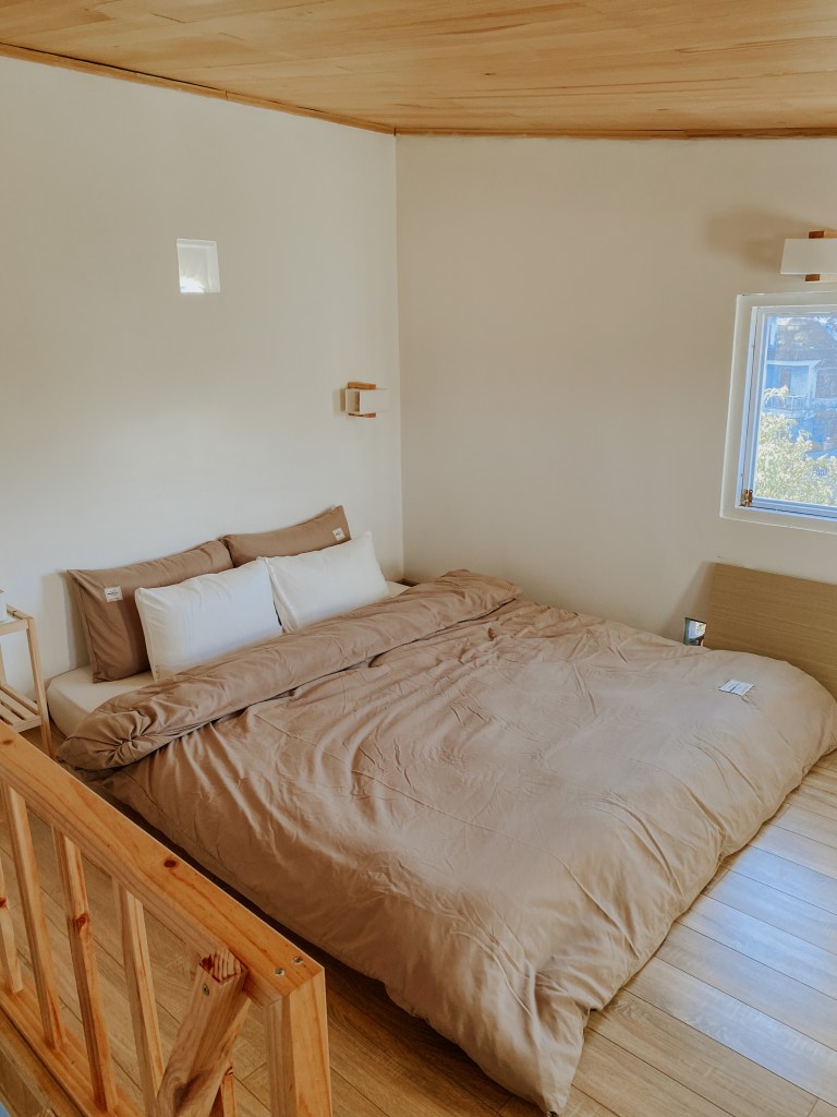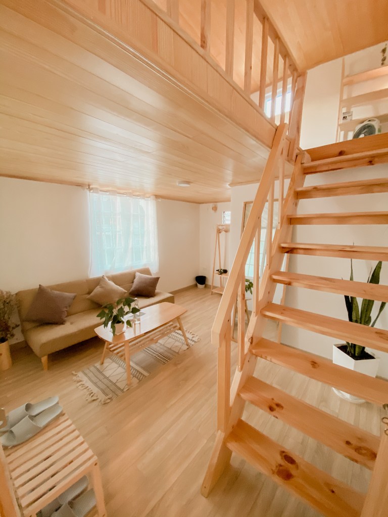 Căn phòng “Trắng” làm mình bất ngờ vì phòng có tới 2 tầng. Tầng dưới với sofa bên cửa sổ để nằm đọc sách, cùng toilet dưới chân cầu thang. Bình nước lọc thuỷ tinh được đặt sẵn trên bàn cạnh sofa cho mình.