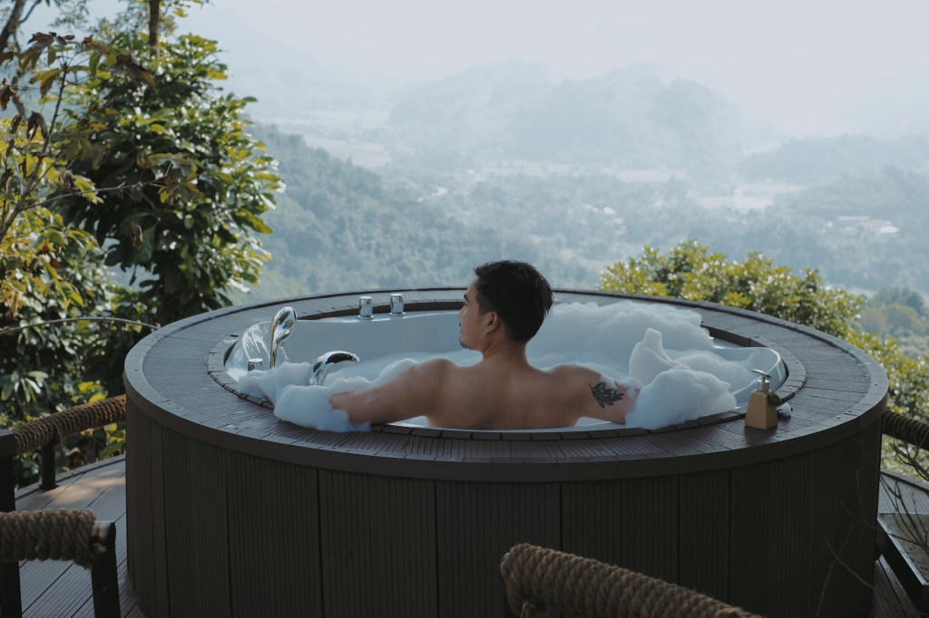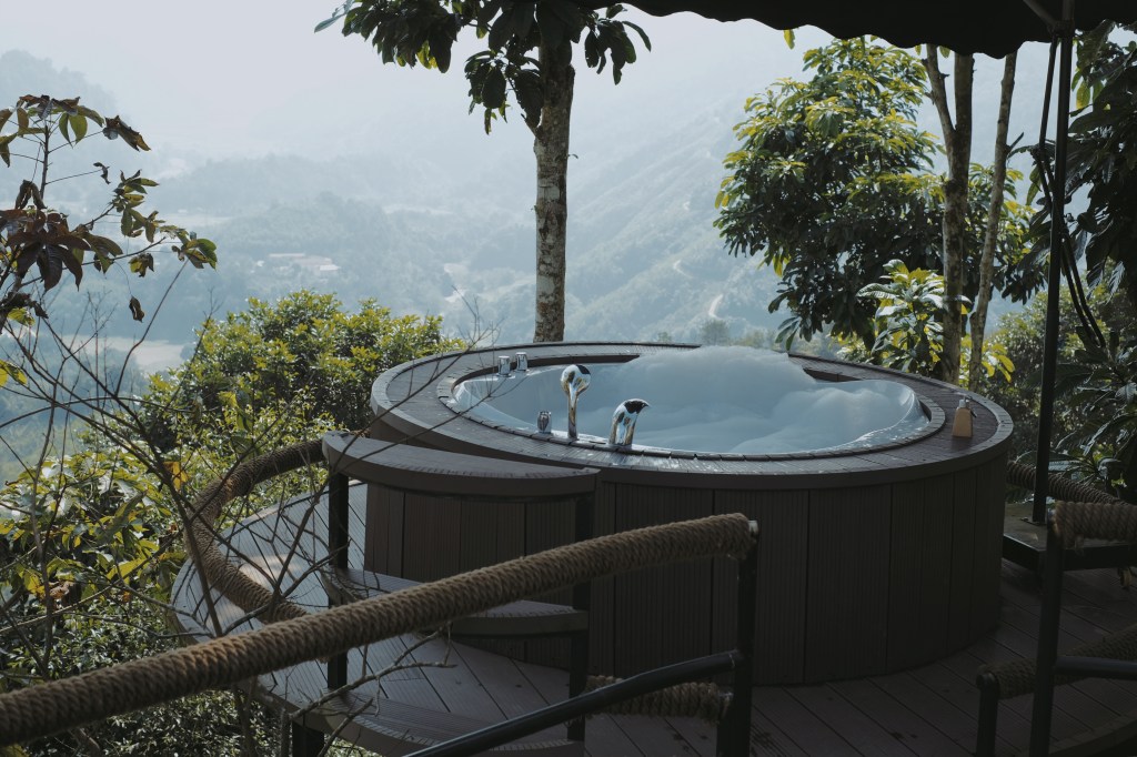 Nhưng, bồn tắm ngoài trời chính là phần topping ngon nhất của The Fluffy. Bật jacuzzi lên, tạo bọt và tận hưởng. Bạn có thể gọi quản gia mang trà nóng tới. Tận hưởng không gian rộng mênh mông của Hà Giang.