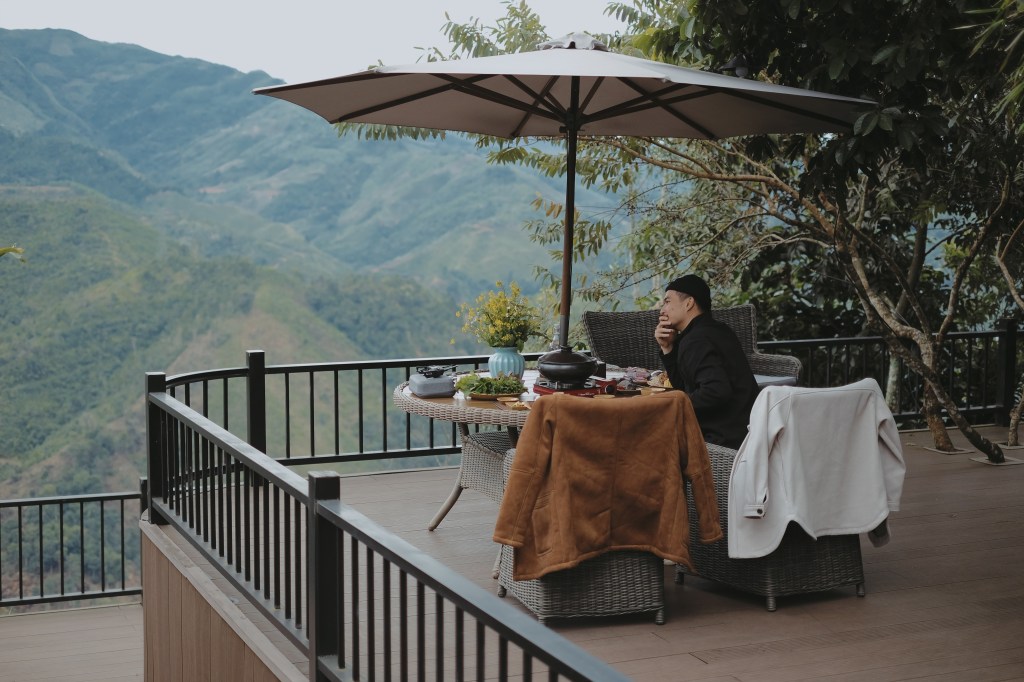 Nhưng điểm hay nhất của phòng là có lối ra cửa sau, mở ra sẽ đưa bạn đến ban công với không gian ăn ngoài trời và ngắm núi rừng. Ngay tại khu vực đó cũng có zipline kết nối với nhà hàng. Bạn có thể trải nghiệm nhé.