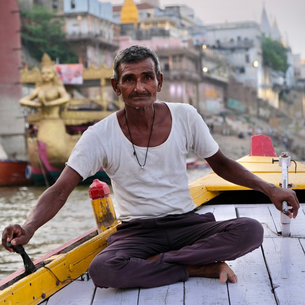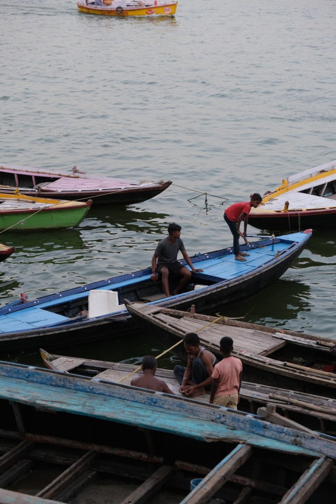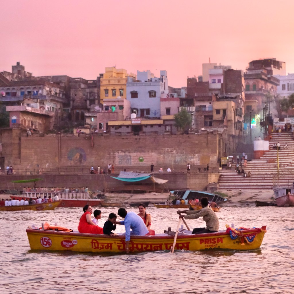 Sau khi nằm nghỉ trưa đợi đến chiều, chuyến đi ngắm sông Hằng bắt đầu trên chiếc thuyền máy. Vừa được chở vừa được nghe thuyết minh nhiều thông tin như những khách sạn tại đây đều được xây trong những cung điện củ của rất nhiều vì vua, vì các vì vua đều muốn mình được an táng tại sông Hằng linh thiêng này. Nhiều ngôi nhà dọc bờ sông cũng có chủ nhân rất đặc biệt như Mother Teresa. Khi nghe đến những cái tên như vậy, mình cứ chợt rùng mình.