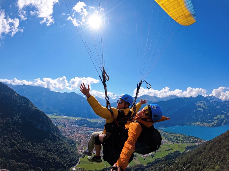 Khi tới Interlaken không thể bỏ qua nhảy dù lượn rồi. Mình tập trung ở ga trung tâm Interlaken và được xe van tới đón đi. Xe đi đón thêm 6 người nữa để đủ 7 người bay cho một khung giờ cùng với 7 phi công. Xe sẽ chở bạn đến núi Beatenberg, tại đó phi công sẽ hướng dẫn bạn chạy đà và mặc đồ bảo hộ cho bạn. Khi gió lên, mình được anh phi công Anders, người Na Uy, kêu chạy, và mình chạy thiệt nhanh và nhấc chân lên là bay. Chuyến bay kéo dài 20 phút nhìn toàn cảnh hồ nước, núi, và thành phố bên dưới. Mình thích mạo hiểm xíu nên có nhờ anh phi công chơi trò lượn vài vòng rất chóng mặt nhưng cực vui.
